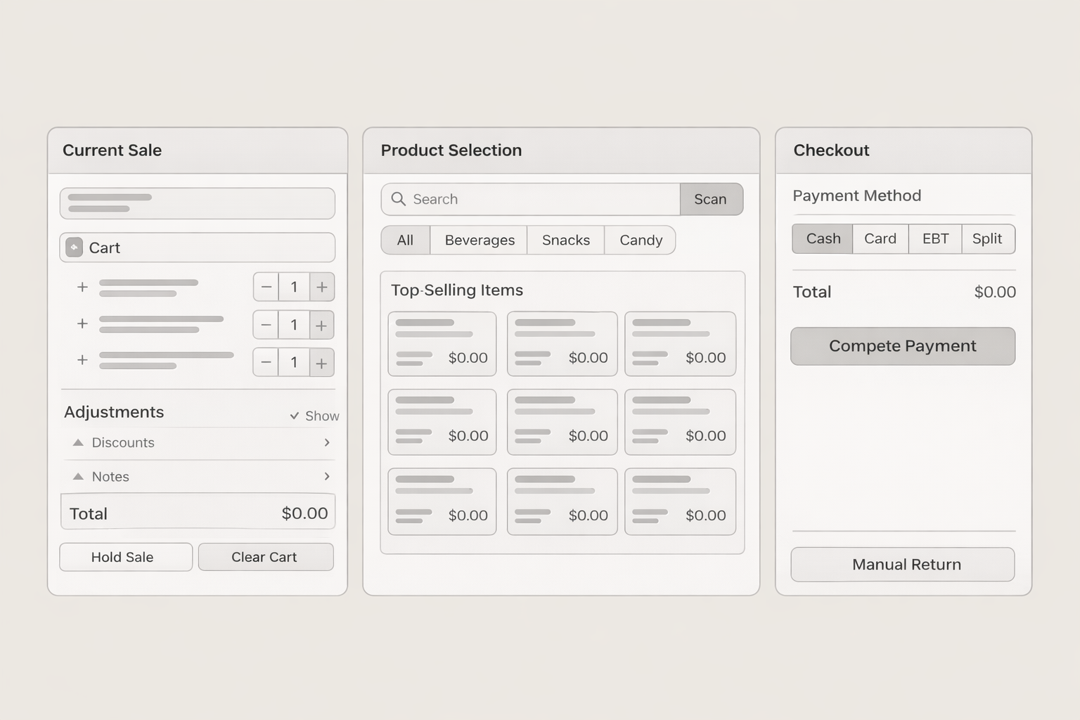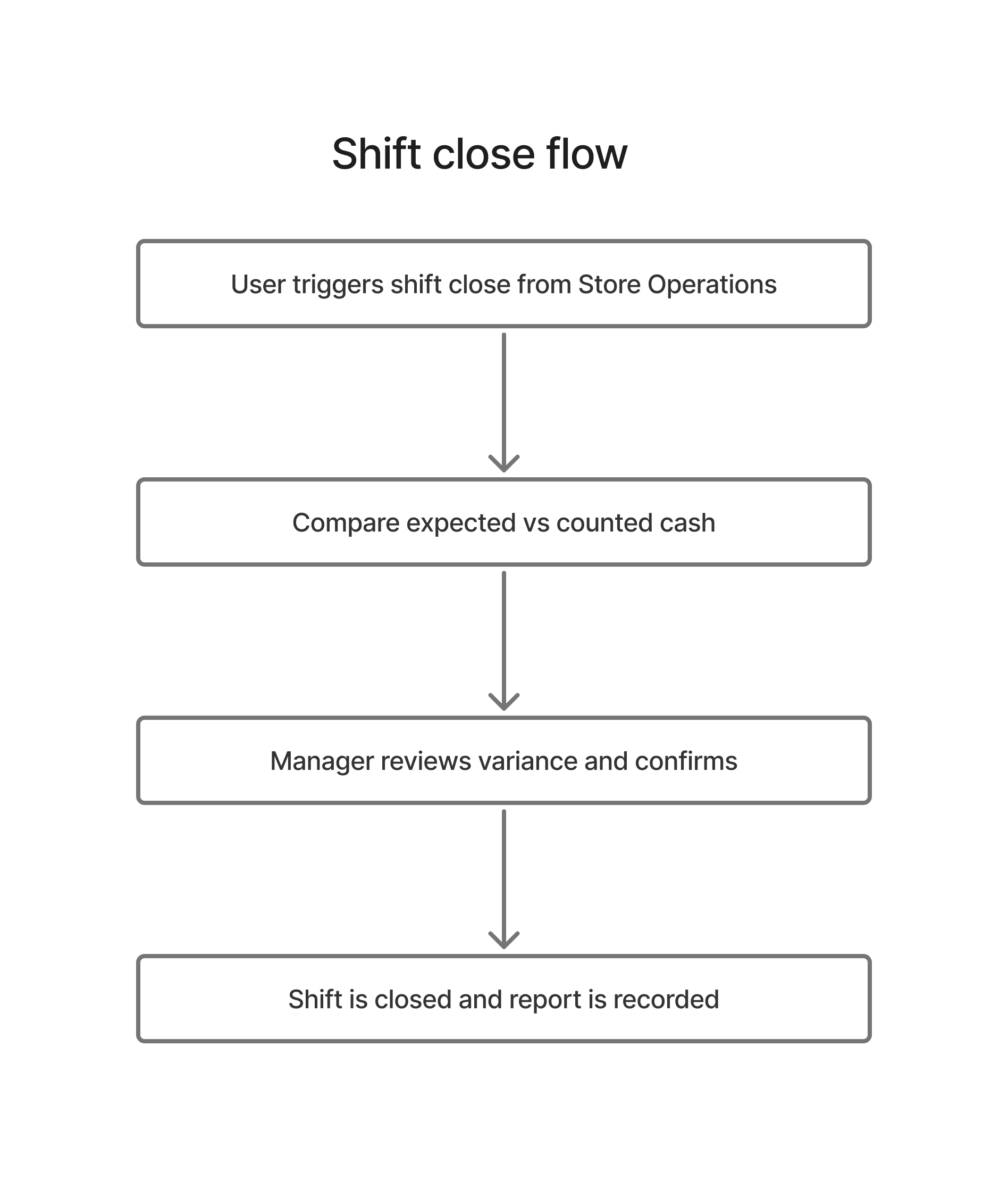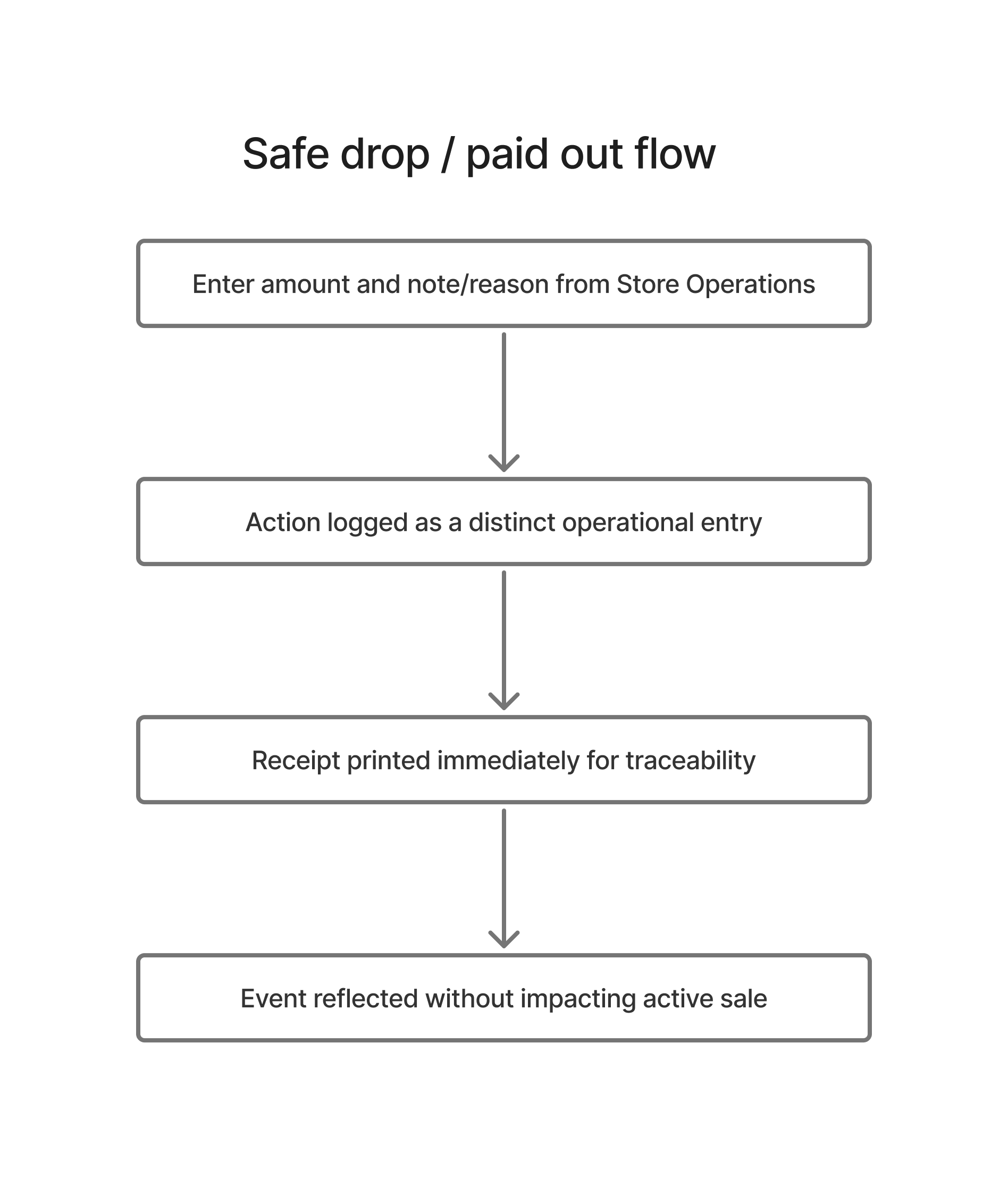 safe drops, paid outs, shift close, reconciliation, and reporting